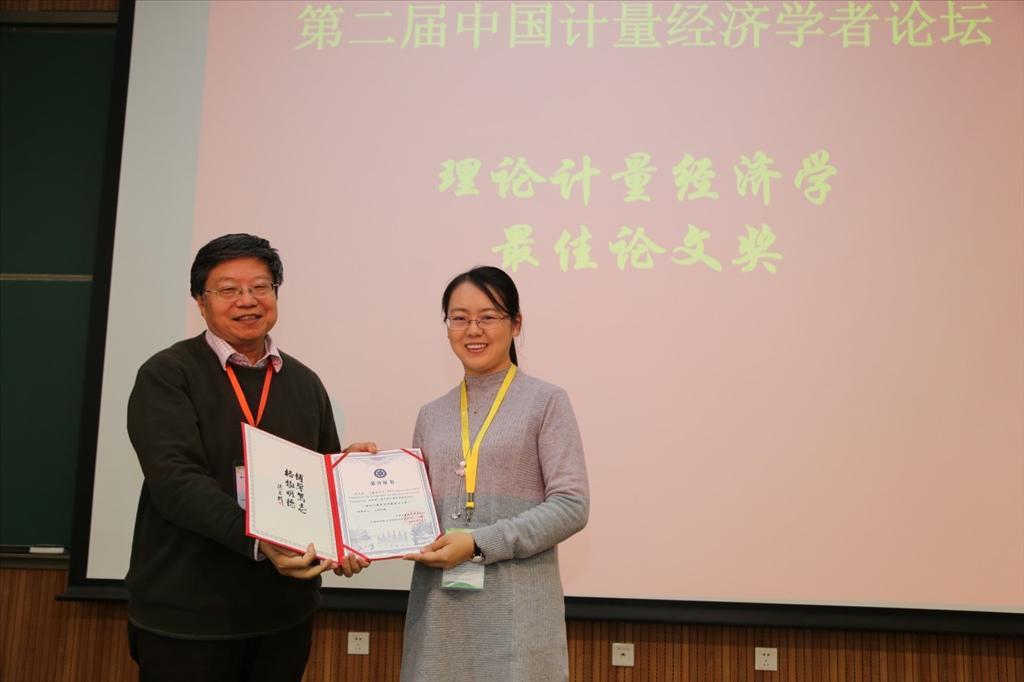首先,杨晓光研究员宣布了本届中国计量经济学者论坛“理论计量经济学最佳论文奖”获奖情况,复旦大学付中昊博士与中山大学王霞副教授合作的论文《Testing for Structural Changes in Factor Models via the Discrete Fourier Transform》经过论坛专家评审委员会评审推选,获得本届“理论计量经济学最佳论文奖”,这也是中国计量经济学者论坛首次设立“理论计量经济学最佳论文奖”,随后,汪寿阳研究员代表论坛主办方为王霞副教授颁发获奖证书。