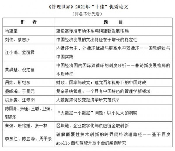 2021年,《管理世界》编辑出版12期,刊发文章175篇。经过栏目编辑推荐、编辑部初筛,选出78篇文章,送50位专家进行投票评审。本着客观公正的原则,综合创新性、学术水平、影响力等方面因素,最终评选出“十佳”优秀论文10篇、优秀论文30篇。