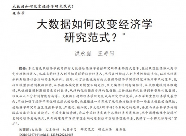 2022年1月25日,《管理世界》公布2021年优秀论文评选结果,洪永淼教授与汪寿阳教授合作的《大数据如何改变经济学研究范式》(《管理世界》2021年第10期)入选《管理世界》2021年“十佳”优秀论文。