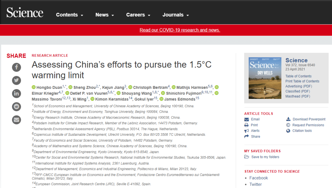 该研究工作于2021年4月22日在Science上发表,为多模型比较技术的发展及碳中和技术经济路径研究作出了示范。