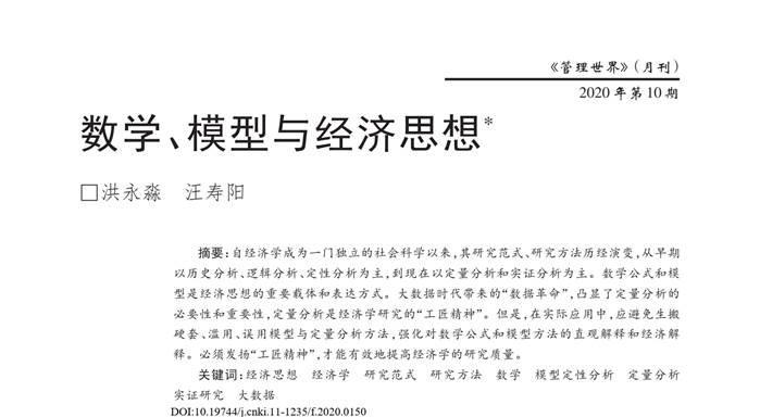 《数学、模型与经济思想》一文指出,长期以来,中国经济学普遍缺乏定量分析,在运用现代经济学研究方法时又时常出现模型误用现象,导致中国经济学界对数学与计量经济学模型在经济研究中的作用一直争论不休。针对这种争论,文章主要探讨了数学、模型以及其他定量分析方法与经济思想之间的关系。首先,作者简要回顾了经济学研究范式的演变历程,指出思想和方法是经济学研究的两大支柱,而数学公式和模型是经济思想的重要载体。其次,作者阐述了数学与模型的局限性,以及使用定量分析方法时需要注意的事项。最后,作者表示,在数字经济时代,“数据革命”给经济学的研究范式与研究方法带来了巨大的挑战与机遇,更加凸显了定量实证分析的重要性。