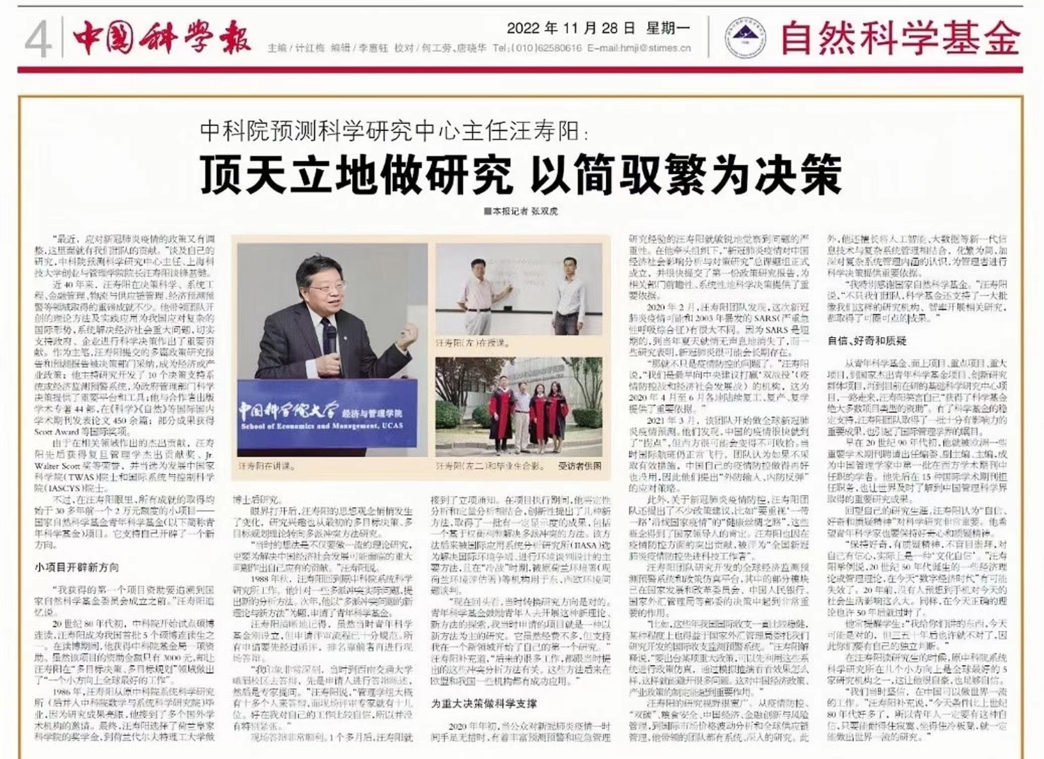 2022年11月28日,《中国科学报》刊发对NSFC“计量建模与经济政策研究”基础科学中心联合负责人、中国科学院预测科学研究中心主任汪寿阳教授的专访报道,现将全文刊载如下:
