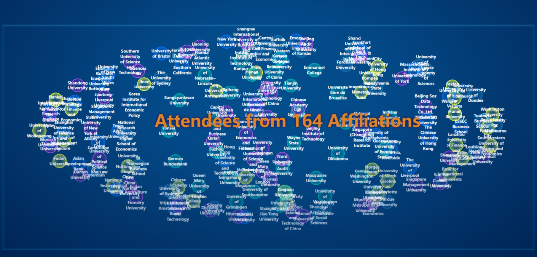 除来自麻省理工学院、纽约大学、宾夕法尼亚州立大学、波士顿大学、奥克兰大学、加州大学河滨分校、西新英格兰大学、德克萨斯农工大学、范德堡大学、不列颠哥伦比亚大学、剑桥大学、伦敦大学学院、ESSEC商学院、图卢兹商学院、罗马第二大学、布里斯托尔大学、鹿特丹伊拉斯姆斯大学、庞贝法布拉大学、穆尔西亚大学、华沙大学、阿姆斯特丹自由大学、新加坡国立大学、南洋理工大学、悉尼大学、莫纳什大学、新南威尔士大学、墨尔本大学、卡塔尔大学、扎耶德大学、秋田国际大学、成均馆大学、香港大学、香港科技大学、台湾清华大学、北京大学、清华大学等境内外高校的学界代表外,还有来自国际粮食研究所、联合国大学世界发展研究院等国际学术研究机构及国际货币基金组织、国际结算银行、亚洲开发银行、德国联邦银行、荷兰商业银行、挪威中央银行、西班牙中央银行等国际金融机构代表人员,总人数近四百人。