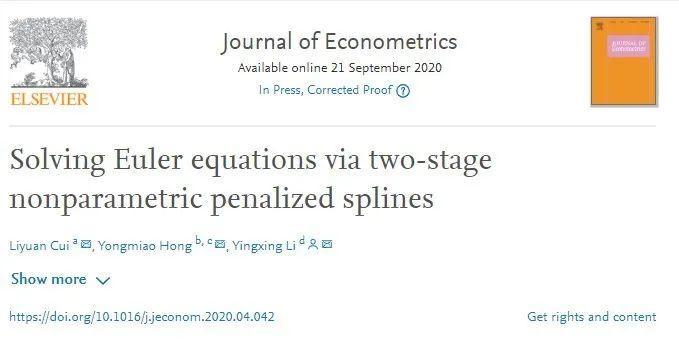 近日,洪永淼教授、李迎星副教授与香港城市大学崔丽媛助理教授合作的论文“Solving Euler Equations Via Two-Stage Nonparametric Penalized Splines”在计量经济学权威刊物Journal of Econometrics上在线发表。