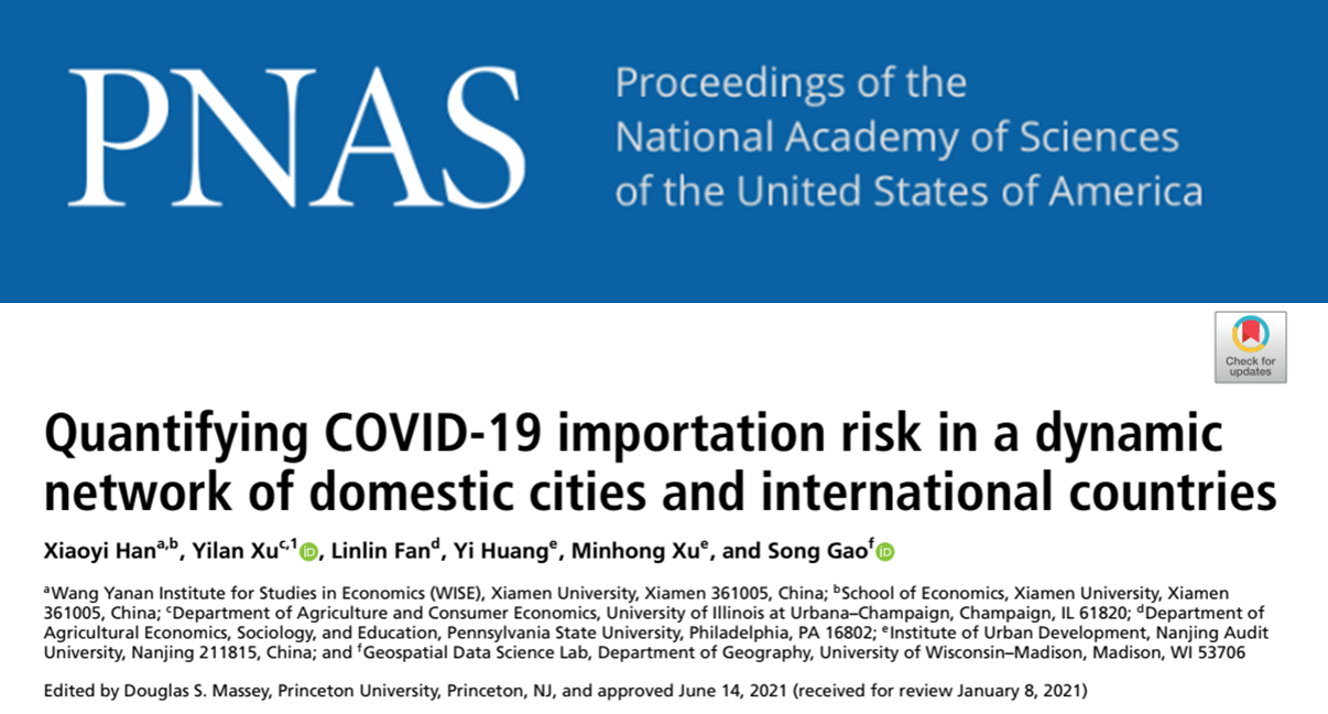 厦大经济学科韩晓祎副教授与美国伊利诺伊大学香槟分校的许亦岚副教授,美国宾夕法尼亚州立大学的樊琳琳助理教授,南京审计大学的黄怡、徐旻鸿助理教授,美国威斯康星大学麦迪逊分校高松副教授合作发表于国际科学界顶级期刊《美国科学院院刊》(Proceedings of the National Academy of Sciences of the United States of America,简称PNAS)的论文,关注如何监测和量化新型冠状病毒的境外输入风险。作者根据2020年1月至4月中国284个城市之间的人口移动大数据和全球48个国家和地区的航班和新冠病例数据来构建疫情传播的动态网络。在此基础上,作者提出了具有时变系数的动态空间面板模型,来刻画城市所面临的本土传播和境外输入风险随着防疫政策的推行所呈现的时间上的变化,并根据相关系数的结构变点来评估政策的有效性。同时,作者还基于2020年1月至4月中国疫情相关数据来量化不同政策情境下新型冠状病毒的境外输入风险。