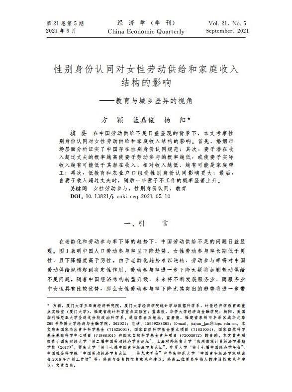 近日,经济学科方颖教授,和华侨大学经济与金融学院蓝嘉俊(WISE 2019届博士毕业生)、美国加利福尼亚大学圣迭戈分校政治科学系杨阳(WISE 2014届硕士毕业生)合作的题为“性别身份认同对女性劳动供给和家庭收入结构的影响——教育与城乡差异的视角”的论文发表在《经济学(季刊)》2021年第21卷第5期。