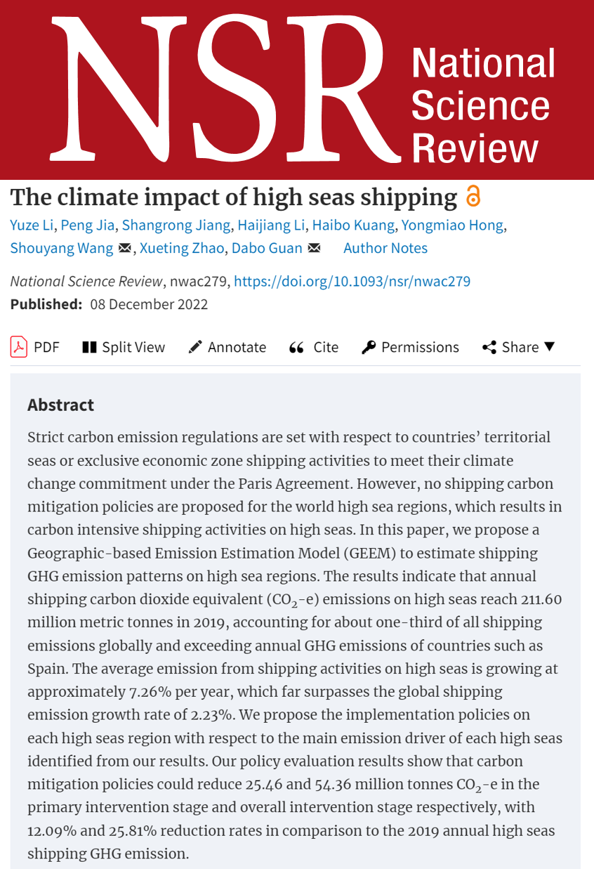 NSFC“计量建模与经济政策研究”基础科学中心负责人汪寿阳、洪永淼团队与大连海事大学贾鹏团队和清华大学地球系统科学系关大博教授合作,在国际上首次用大数据方法研究了公海碳排放对气候的影响,相关论文“The Climate Impact of High Seas Shipping”近日于National Science Review(《国家科学评论》)刊发。