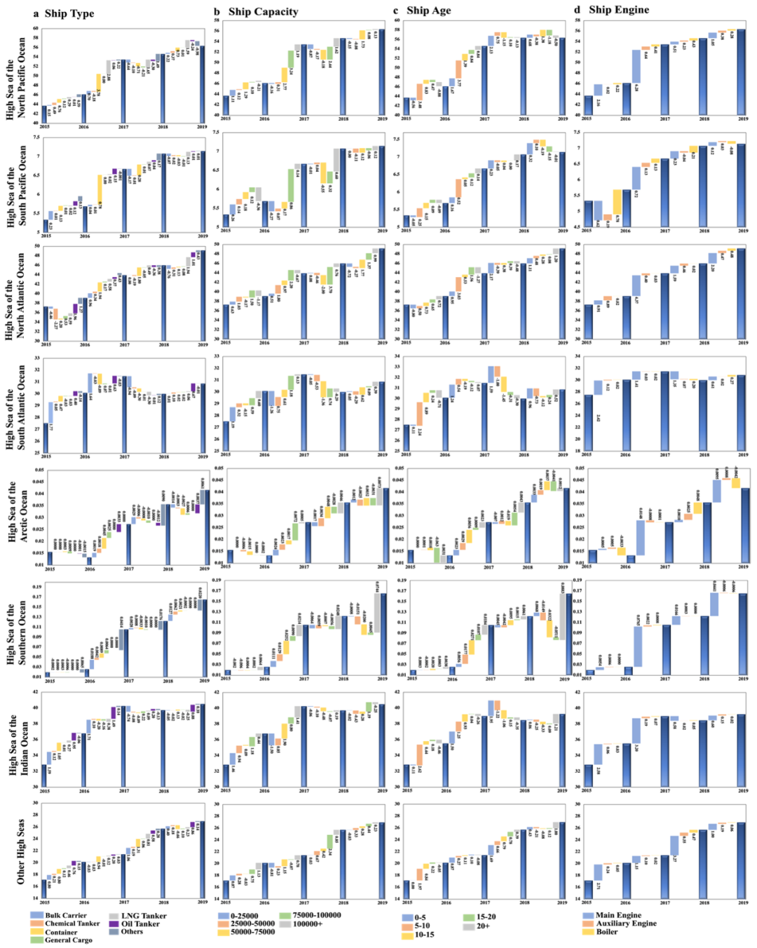 研究者提出了一个基于地理的排放估计模型(GEEM)来估计公海区域航运温室气体排放模式,测算了全球公海范围内2015年至2019年船舶二氧化碳排放当量(CO2-e)。结果表明,2019年全球公海航运CO2-e年排放量达2.116亿吨,约占全球航运排放总量的1/3,超过了西班牙等国家全年的温室气体排放量。公海航运活动的平均排放量以每年约7.26%的速度增长,该增长速度远超全球航运排放量2.23%的增长率。