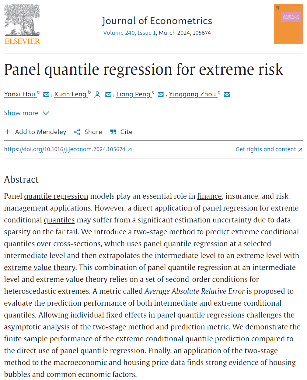 近日,厦门大学经济学科冷旋副教授、周颖刚教授,与复旦大学侯燕曦副教授、佐治亚州立大学彭亮教授合作的题为“Panel Quantile Regression for Extreme Risk”的论文发表在Journal of Econometrics 2024年第240卷第1期。Journal of Econometrics是学界公认的计量经济学和统计学领域权威期刊,也是我校认定的国际A类期刊。本文是国家自然科学基金委员会“计量建模与经济政策研究”基础科学中心项目的阶段性成果。