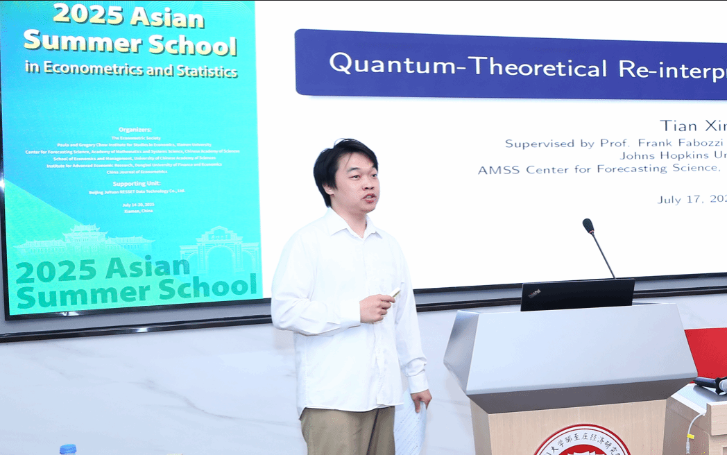 随后,美国约翰霍普金斯大学田鑫带来题为“Quantum-Theoretical Re-interpretation of Pricing Theory”的汇报。