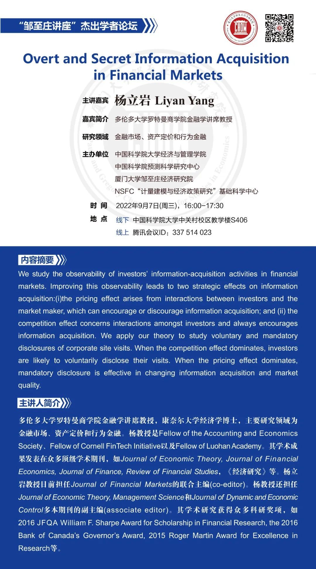 杨立岩,多伦多大学罗特曼商学院金融学讲席教授,康奈尔大学经济学博士,主要研究领域为金融市场、资产定价和行为金融。杨教授是Fellow of the Accounting and Economics Society、Fellow of Cornell FinTech Initiative以及Fellow of Luohan Academy。其学术成果发表在众多顶级学术期刊,如Journal of Economic Theory, Journal of Financial Economics, Journal of Finance, Review of Financial Studies,《经济研究》等。杨立岩教授目前担任Journal of Financial Markets的联合主编(co-editor)。杨教授还担任Journal of Economic Theory, Management Science和Journal of Dynamic and Economic Control多本期刊的副主编(associate editor)。其学术研究获得众多科研奖项,如2016 JFQA William F. Sharpe Award for Scholarship in Financial Research, the 2016 Bank of Canada’s Governor’s Award, 2015 Roger Martin Award for Excellence in Research等。