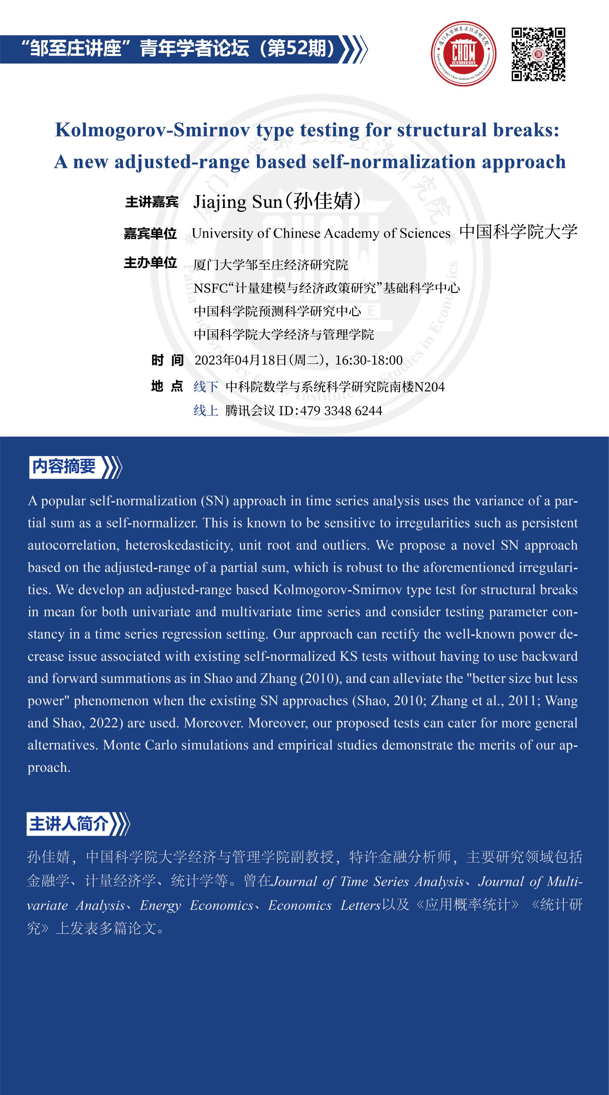 报告题目:Kolmogorov-Smirnov type testing for structural breaks: A new adjusted-range based self-normalization approach