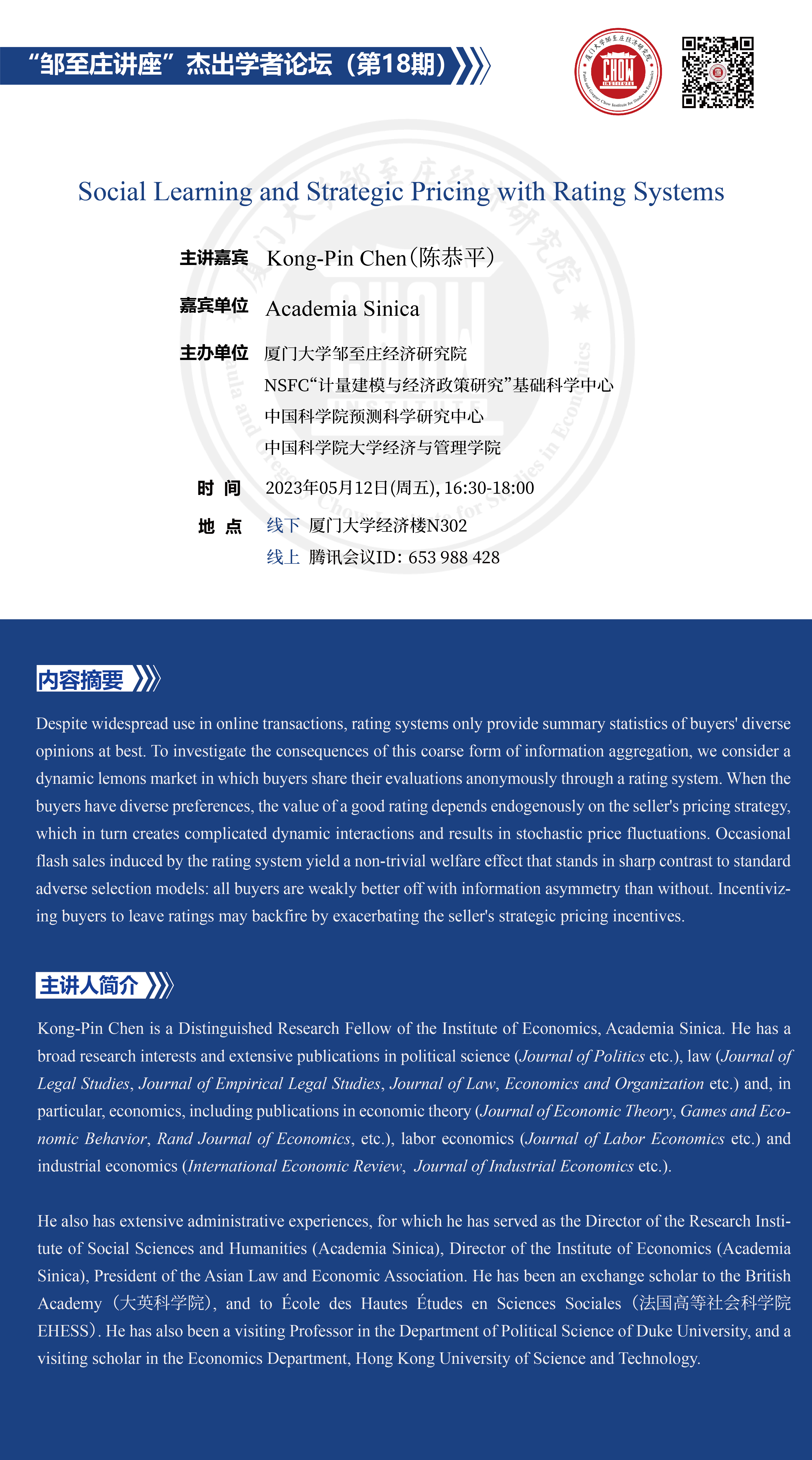 Kong-Pin Chen is a Distinguished Research Fellow of the Institute of Economics, Academia Sinica. He has a broad research interests and extensive publications in political science (Journal of Politics etc.), law (Journal of Legal Studies, Journal of Empirical Legal Studies, Journal of Law, Economics and Organization etc.) and, in particular, economics, including publications in economic theory (Journal of Economic Theory, Games and Economic Behavior, Rand Journal of Economics, etc.), labor economics (Journal of Labor Economics etc.) and industrial economics (International Economic Review, Journal of Industrial Economics etc.).