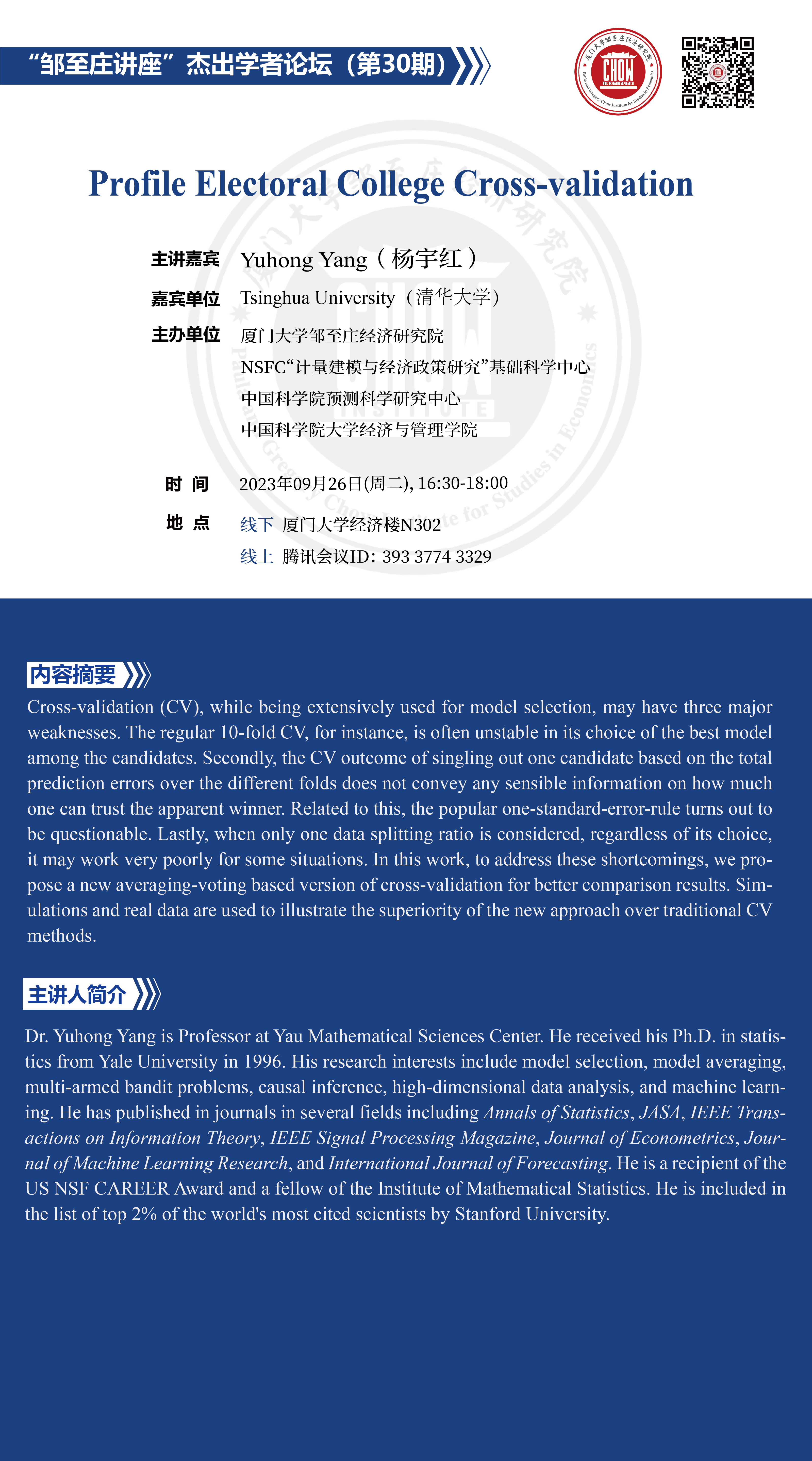 Dr. Yuhong Yang is Professor at Yau Mathematical Sciences Center. He received his Ph.D. in statistics from Yale University in 1996. His research interests include model selection, model averaging, multi-armed bandit problems, causal inference, high-dimensional data analysis, and machine learning. He has published in journals in several fields including Annals of Statistics, JASA, IEEE Transactions on Information Theory, IEEE Signal Processing Magazine, Journal of Econometrics, Journal of Machine Learning Research, and International Journal of Forecasting. He is a recipient of the US NSF CAREER Award and a fellow of the Institute of Mathematical Statistics. He is included in the list of top 2% of the world's most cited scientists by Stanford University.