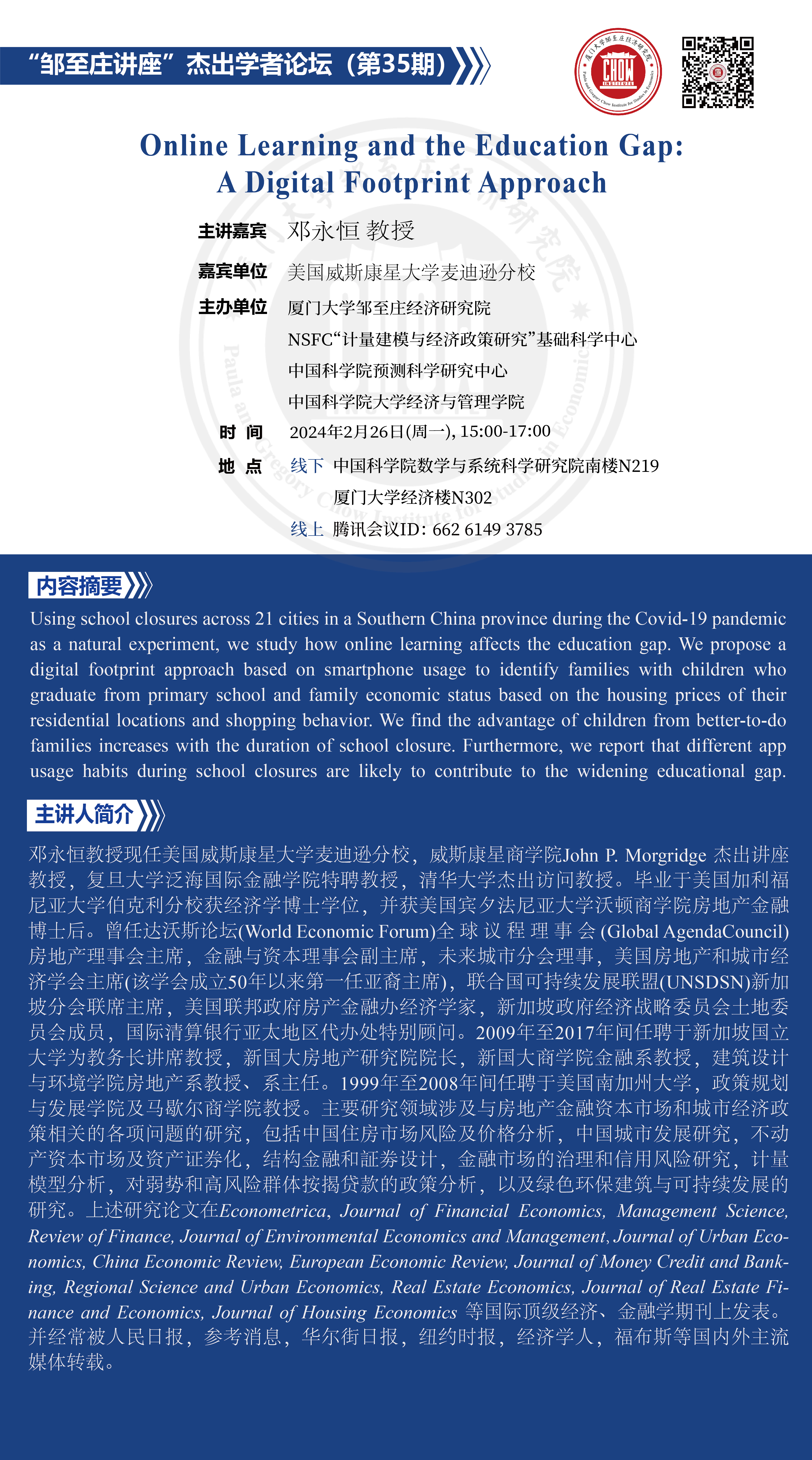 邓永恒教授现任美国威斯康星大学麦迪逊分校,威斯康星商学院John P. Morgridge 杰出讲座教授,复旦大学泛海国际金融学院特聘教授,清华大学杰出访问教授。毕业于美国加利福尼亚大学伯克利分校获经济学博士学位,并获美国宾夕法尼亚大学沃顿商学院房地产金融博士后。曾任达沃斯论坛(World Economic Forum)全 球 议 程 理 事 会 (Global AgendaCouncil)房地产理事会主席,金融与资本理事会副主席,未来城市分会理事,美国房地产和城市经济学会主席(该学会成立50年以来第一任亚裔主席),联合国可持续发展联盟(UNSDSN)新加坡分会联席主席,美国联邦政府房产金融办经济学家,新加坡政府经济战略委员会土地委员会成员,国际清算银行亚太地区代办处特别顾问。2009年至2017年间任聘于新加坡国立大学为教务长讲席教授,新国大房地产研究院院长,新国大商学院金融系教授,建筑设计与环境学院房地产系教授、系主任。1999年至2008年间任聘于美国南加州大学,政策规划与发展学院及马歇尔商学院教授。主要研究领域涉及与房地产金融资本市场和城市经济政策相关的各项问题的研究,包括中国住房市场风险及价格分析,中国城市发展研究,不动产资本市场及资产证券化,结构金融和証劵设计,金融市场的治理和信用风险研究,计量模型分析,对弱势和高风险群体按揭贷款的政策分析,以及绿色环保建筑与可持续发展的研究。上述研究论文在Econometrica, Journal of Financial Economics, Management Science, Review of Finance, Journal of Environmental Economics and Management, Journal of Urban Economics, China Economic Review, European Economic Review, Journal of Money Credit and Banking, Regional Science and Urban Economics, Real Estate Economics, Journal of Real Estate Finance and Economics, Journal of Housing Economics 等国际顶级经济、金融学期刊上发表。并经常被人民日报,参考消息,华尔街日报,纽约时报,经济学人,福布斯等国内外主流媒体转载。