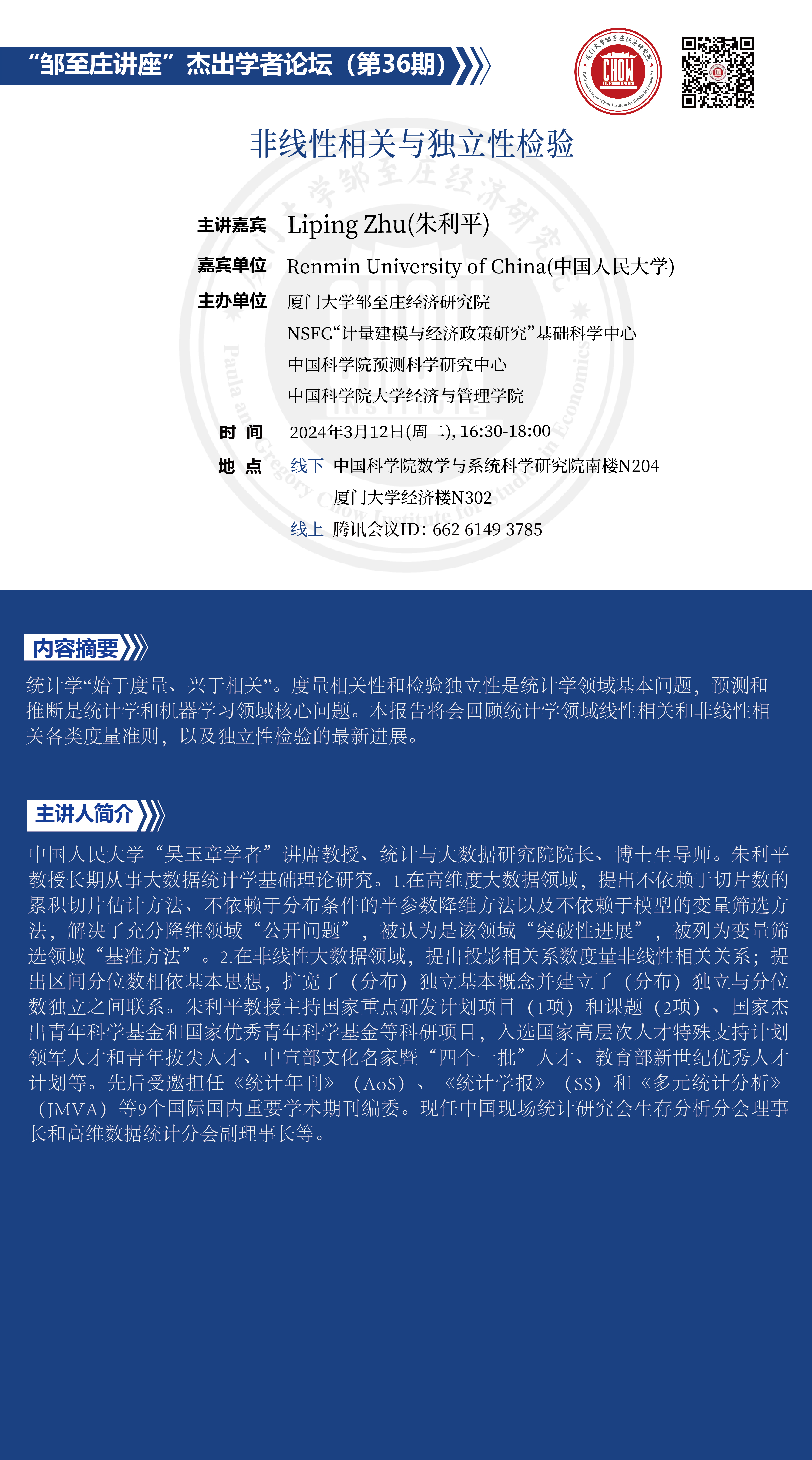 朱利平,中国人民大学“吴玉章学者”讲席教授、统计与大数据研究院院长、博士生导师。朱利平教授长期从事大数据统计学基础理论研究: 1. 在高维度大数据领域,提出不依赖于切片数的累积切片估计方法、不依赖于分布条件的半参数降维方法以及不依赖于模型的变量筛选方法,解决了充分降维领域“公开问题”,被认为是该领域“突破性进展”,被列为变量筛选领域“基准方法”; 2. 在非线性大数据领域,提出投影相关系数度量非线性相关关系;提出区间分位数相依基本思想,扩宽了(分布)独立基本概念并建立了(分布)独立与分位数独立之间联系。朱利平教授主持国家重点研发计划项目(1项)和课题(2项)、国家杰出青年科学基金和国家优秀青年科学基金等科研项目,入选国家高层次人才特殊支持计划领军人才和青年拔尖人才、中宣部文化名家暨“四个一批”人才、教育部新世纪优秀人才计划等。先后受邀担任《统计年刊》(AoS)、《统计学报》(SS)和《多元统计分析》(JMVA)等9个国际国内重要学术期刊编委。现任中国现场统计研究会生存分析分会理事长和高维数据统计分会副理事长等。