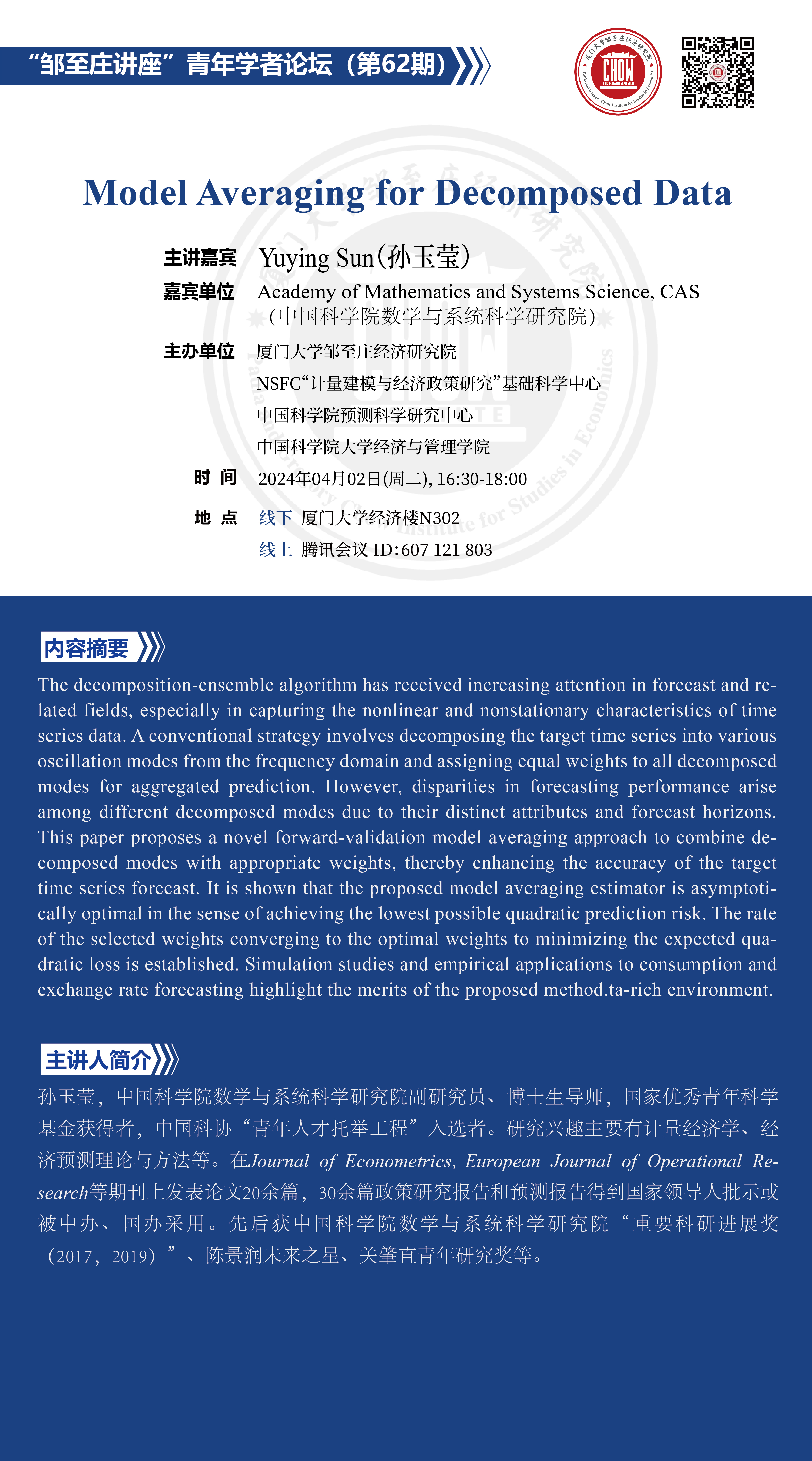 孙玉莹,中国科学院数学与系统科学研究院副研究员、博士生导师,国家优秀青年科学基金获得者,中国科协“青年人才托举工程”入选者。研究兴趣主要有计量经济学、经济预测理论与方法等。在Journal of Econometrics, European Journal of Operational Research等期刊上发表论文20余篇,30余篇政策研究报告和预测报告得到国家领导人批示或被中办、国办采用。先后获中国科学院数学与系统科学研究院“重要科研进展奖(2017,2019)”、陈景润未来之星、关肇直青年研究奖等。