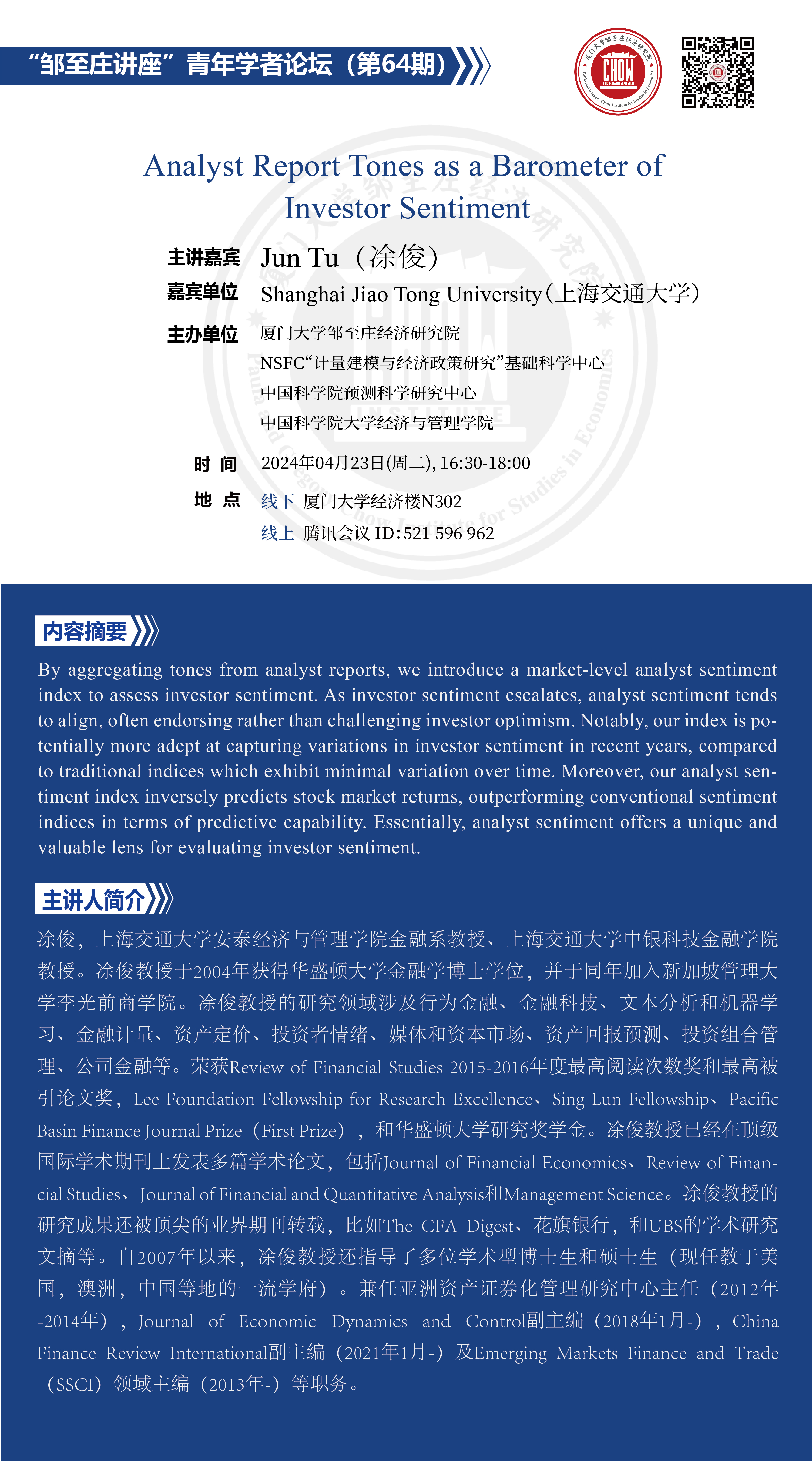凃俊,上海交通大学安泰经济与管理学院金融系教授、上海交通大学中银科技金融学院教授。凃俊教授于2004年获得华盛顿大学金融学博士学位,并于同年加入新加坡管理大学李光前商学院。凃俊教授的研究领域涉及行为金融、金融科技、文本分析和机器学习、金融计量、资产定价、投资者情绪、媒体和资本市场、资产回报预测、投资组合管理、公司金融等。荣获Review of Financial Studies 2015-2016年度最高阅读次数奖和最高被引论文奖,Lee Foundation Fellowship for Research Excellence、Sing Lun Fellowship、Pacific Basin Finance Journal Prize(First Prize),和华盛顿大学研究奖学金。凃俊教授已经在顶级国际学术期刊上发表多篇学术论文,包括Journal of Financial Economics、Review of Financial Studies、Journal of Financial and Quantitative Analysis和Management Science。凃俊教授的研究成果还被顶尖的业界期刊转载,比如The CFA Digest、花旗银行,和UBS的学术研究文摘等。自2007年以来,凃俊教授还指导了多位学术型博士生和硕士生(现任教于美国,澳洲,中国等地的一流学府)。兼任亚洲资产证券化管理研究中心主任(2012年-2014年),Journal of Economic Dynamics and Control副主编(2018年1月-),China Finance Review International副主编(2021年1月-)及Emerging Markets Finance and Trade(SSCI)领域主编(2013年-)等职务。