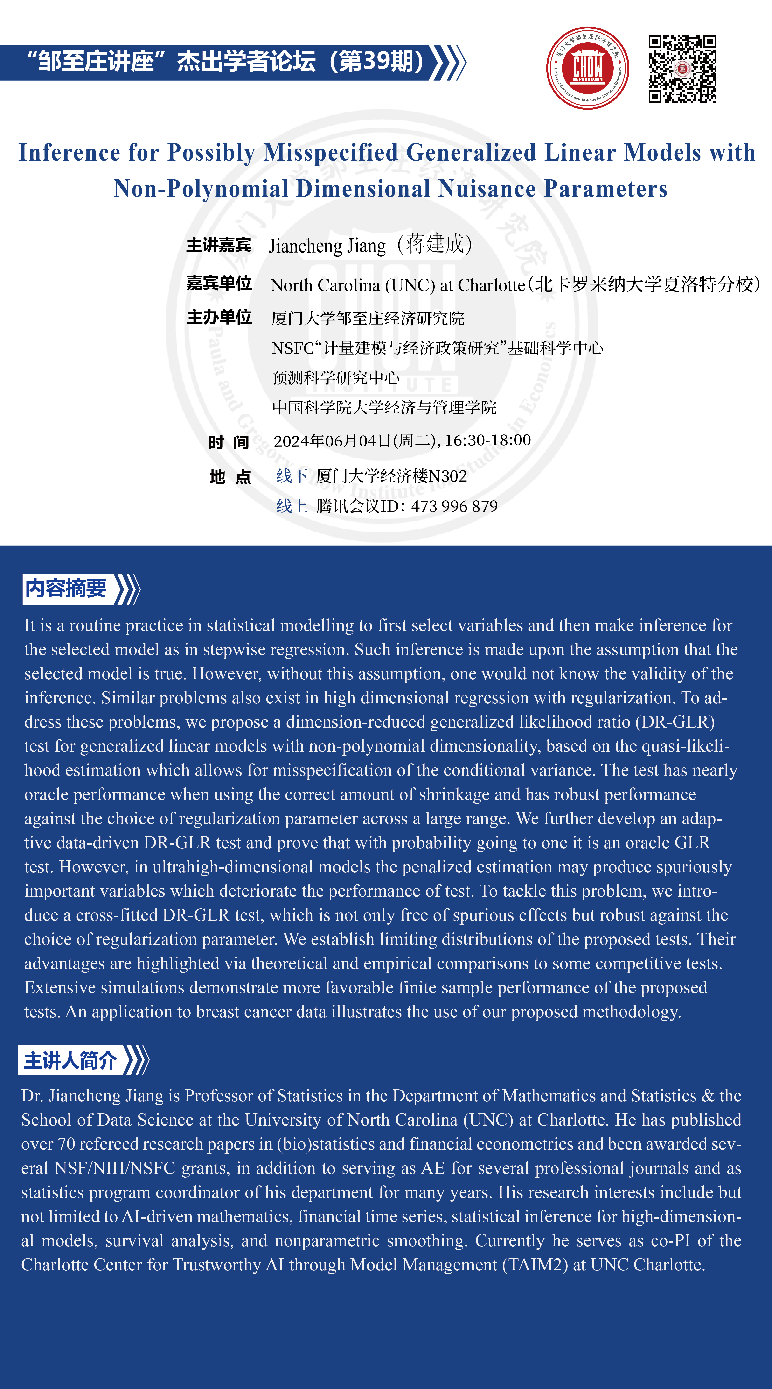 Dr. Jiancheng Jiang is Professor of Statistics in the Department of Mathematics and Statistics & the School of Data Science at the University of North Carolina (UNC) at Charlotte. He has published over 70 refereed research papers in (bio)statistics and financial econometrics and been awarded several NSF/NIH/NSFC grants, in addition to serving as AE for several professional journals and as statistics program coordinator of his department for many years. His research interests include but not limited to AI-driven mathematics, financial time series, statistical inference for high-dimensional models, survival analysis, and nonparametric smoothing. Currently he serves as co-PI of the Charlotte Center for Trustworthy AI through Model Management (TAIM2) at UNC Charlotte.