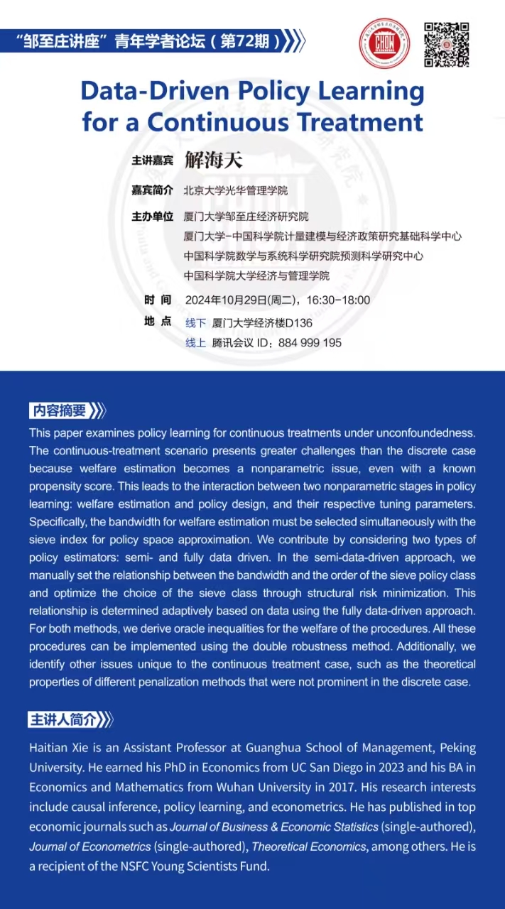 Haitian Xie is an Assistant Professor at Guanghua School of Management, Peking University. He earned his PhD in Economics from UC San Diego in 2023 and his BA in Economics and Mathematics from Wuhan University in 2017. His research interests include causal inference, policy learning, and econometrics. He has published in top economic journals such as Journal of Business & Economic Statistics (single-authored), Journal of Econometrics (single-authored), Theoretical Economics, among others. He is a recipient of the NSFC Young Scientists Fund.