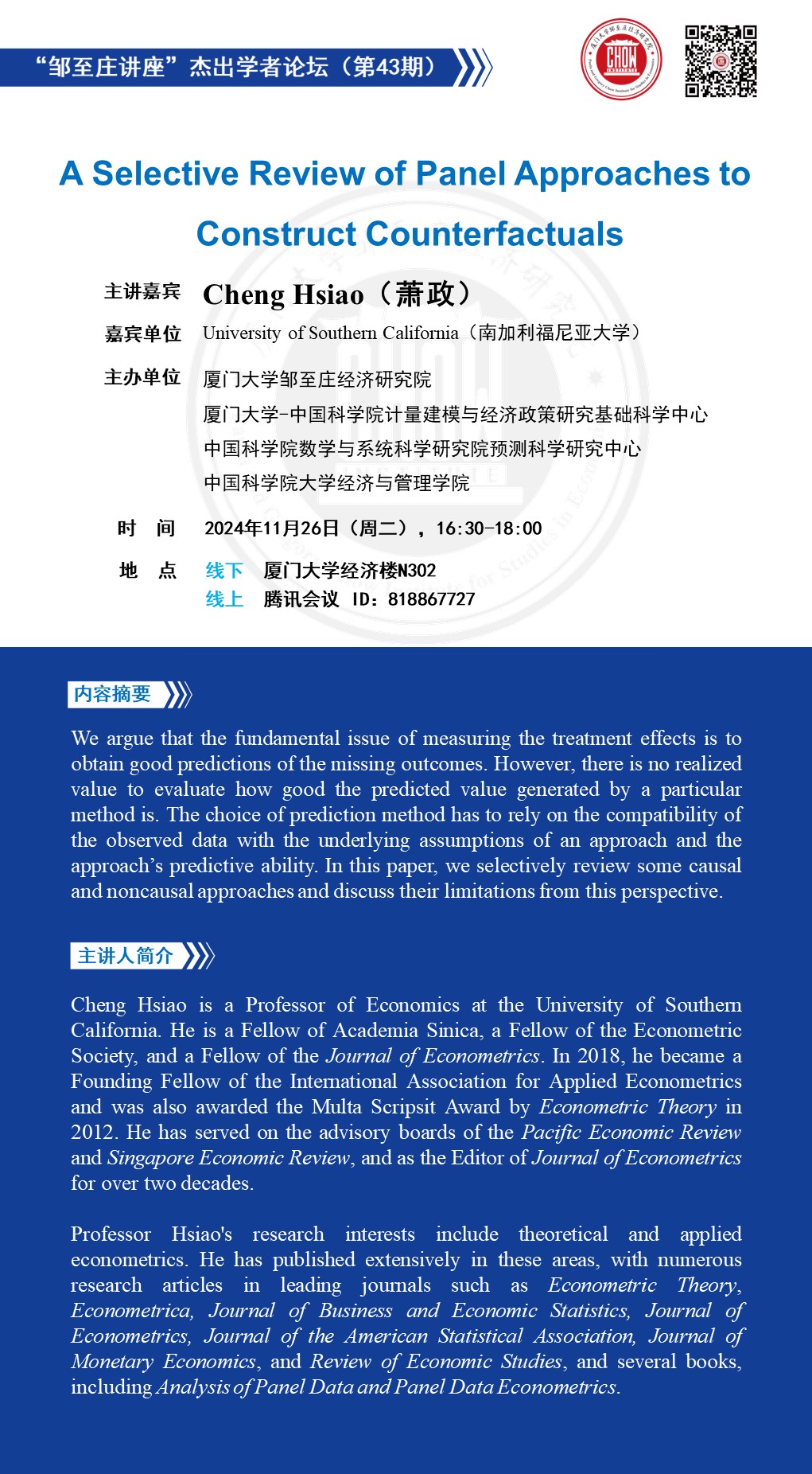 Cheng Hsiao is a Professor of Economics at the University of Southern California. He is a Fellow of Academia Sinica, a Fellow of the Econometric Society, and a Fellow of the Journal of Econometrics. In 2018, he became a Founding Fellow of the International Association for Applied Econometrics and was also awarded the Multa Scripsit Award by Econometric Theory in 2012. He has served on the advisory boards of the Pacific Economic Review and Singapore Economic Review, and as the Editor of Journal of Econometrics for over two decades.