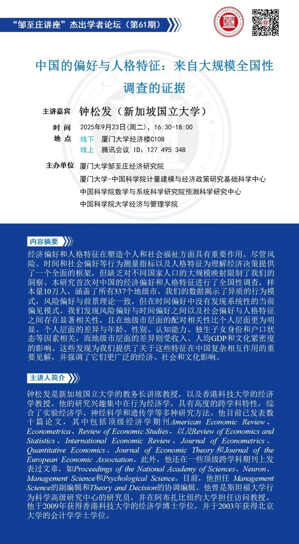 报告题目:中国的偏好与人格特征:来自大规模全国性调查的证据