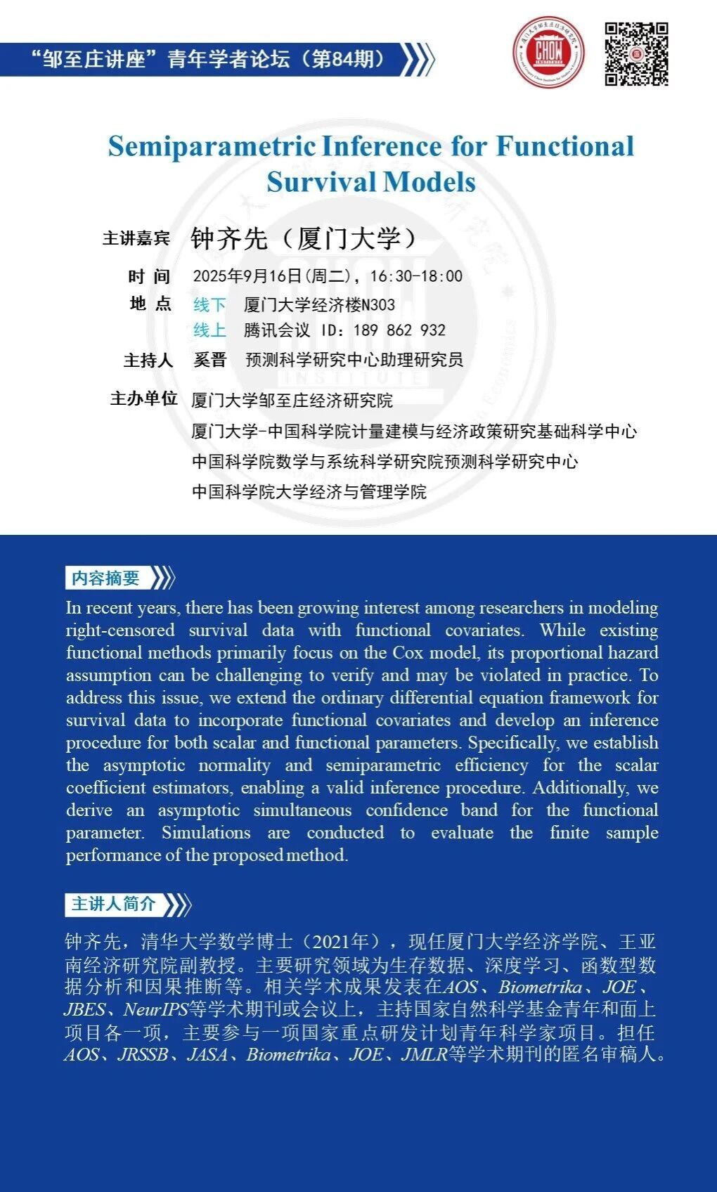 清华大学数学博士(2021年),现任厦门大学经济学院、王亚南经济研究院副教授。主要研究领域为生存数据、深度学习、函数型数据分析和因果推断等。相关学术成果发表在AOS、Biometrika、JOE、JBES、NeurIPS等学术期刊或会议上,主持国家自然科学基金青年和面上项目各一项,主要参与一项国家重点研发计划青年科学家项目。担任AOS、JRSSB、JASA、Biometrika、JOE、JMLR等学术期刊的匿名审稿人。