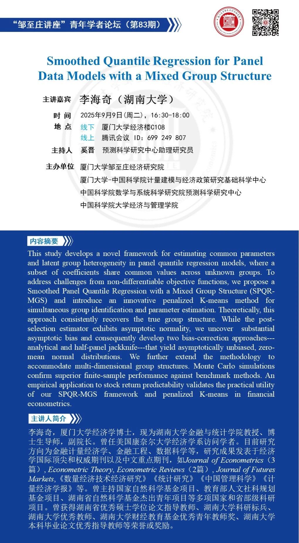 报告题目:Smoothed Quantile Regression for Panel Data Models with a Mixed Group Structure