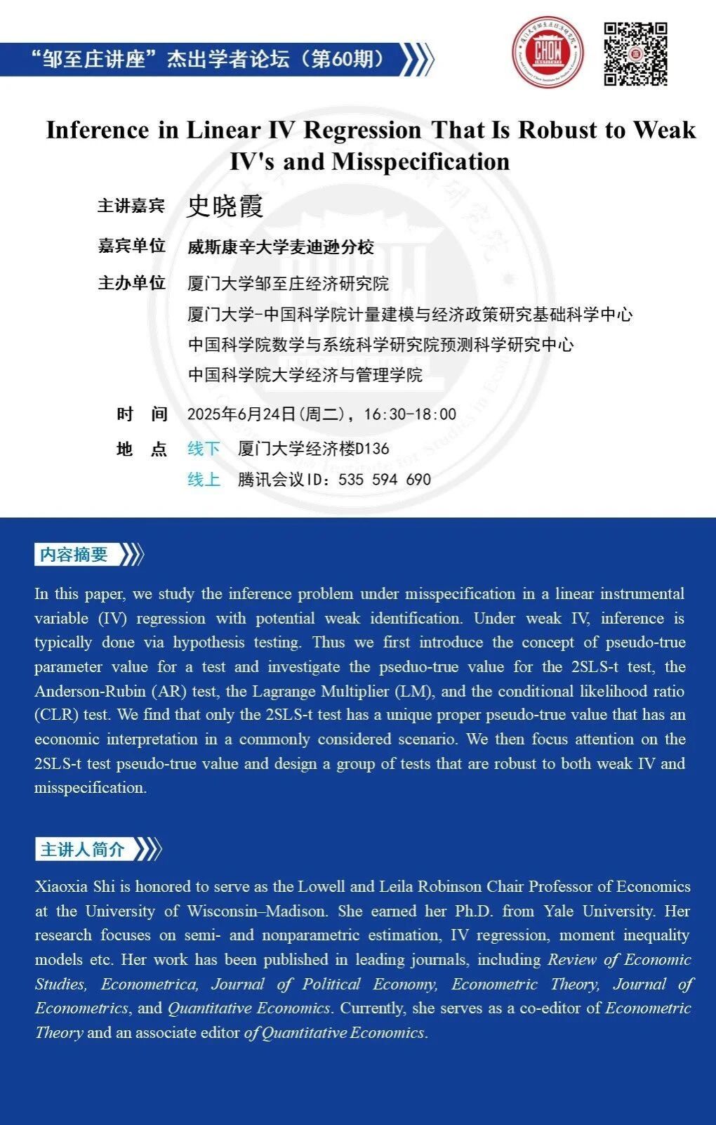 Xiaoxia Shi is honored to serve as the Lowell and Leila Robinson Chair Professor of Economics at the University of Wisconsin–Madison. She earned her Ph.D. from Yale University. Her research focuses on semi- and nonparametric estimation, IV regression, moment inequality models etc. Her work has been published in leading journals, including Review of Economic Studies, Econometrica, Journal of Political Economy, Econometric Theory, Journal of Econometrics, and Quantitative Economics. Currently, she serves as a co-editor of Econometric Theory and an associate editor of Quantitative Economics.