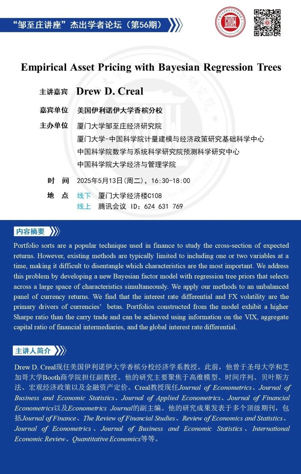 Drew D. Creal现任美国伊利诺伊大学香槟分校经济学系教授。此前,他曾于圣母大学和芝加哥大学Booth商学院担任副教授。他的研究主要聚焦于高维模型、时间序列、贝叶斯方法、宏观经济政策以及金融资产定价。Creal教授现任Journal of Econometrics、Journal of Business and Economic Statistics、Journal of Applied Econometrics、Journal of Financial Econometrics以及Econometrics Journal的副主编。他的研究成果发表于多个顶级期刊,包括Journal of Finance、The Review of Financial Studies、Review of Economics and Statistics、Journal of Econometrics、Journal of Business and Economic Statistics、International Economic Review、Quantitative Economics等。