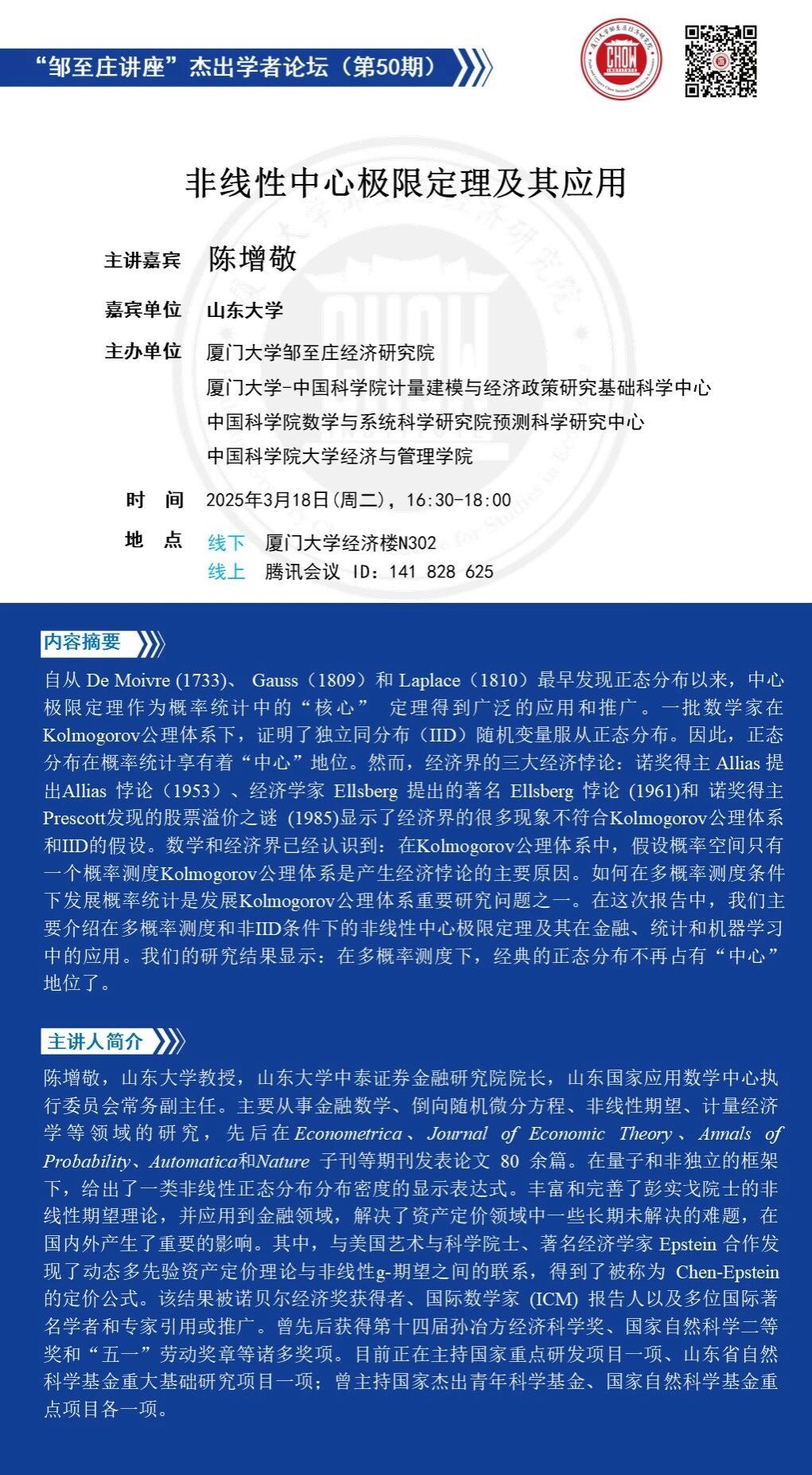 山东大学教授,山东大学中泰证券金融研究院院长,山东国家应用数学中心执行委员会常务副主任。主要从事金融数学、倒向随机微分方程、非线性期望、计量经济学等领域的研究,先后在Econometrica、Journal of Economic Theory、Annals of Probability、Automatica和Nature 子刊等期刊发表论文 80 余篇。在量子和非独立的框架下,给出了一类非线性正态分布分布密度的显示表达式。丰富和完善了彭实戈院士的非线性期望理论,并应用到金融领域,解决了资产定价领域中一些长期未解决的难题,在国内外产生了重要的影响。其中,与美国艺术与科学院士、著名经济学家 Epstein 合作发现了动态多先验资产定价理论与非线性g-期望之间的联系,得到了被称为 Chen-Epstein 的定价公式。该结果被诺贝尔经济奖获得者、国际数学家 (ICM) 报告人以及多位国际著名学者和专家引用或推广。曾先后获得第十四届孙冶方经济科学奖、国家自然科学二等奖和“五一”劳动奖章等诸多奖项。目前正在主持国家重点研发项目一项、山东省自然科学基金重大基础研究项目一项;曾主持国家杰出青年科学基金、国家自然科学基金重点项目各一项。