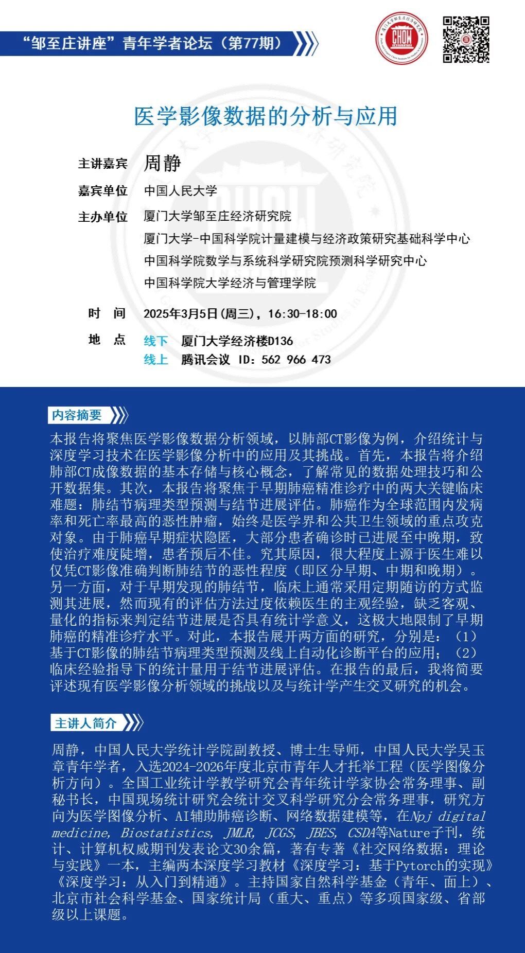 周静,中国人民大学统计学院副教授、博士生导师,中国人民大学吴玉章青年学者,入选2024-2026年度北京市青年人才托举工程(医学图像分析方向)。全国工业统计学教学研究会青年统计学家协会常务理事、副秘书长,中国现场统计研究会统计交叉科学研究分会常务理事,研究方向为医学图像分析、AI辅助肺癌诊断、网络数据建模等,在Npj digital medicine, Biostatistics, JMLR, JCGS, JBES, CSDA等Nature子刊,统计、计算机权威期刊发表论文30余篇,著有专著《社交网络数据:理论与实践》一本,主编两本深度学习教材《深度学习:基于Pytorch的实现》《深度学习:从入门到精通》。主持国家自然科学基金(青年、面上)、北京市社会科学基金、国家统计局(重大、重点)等多项国家级、省部级以上课题。