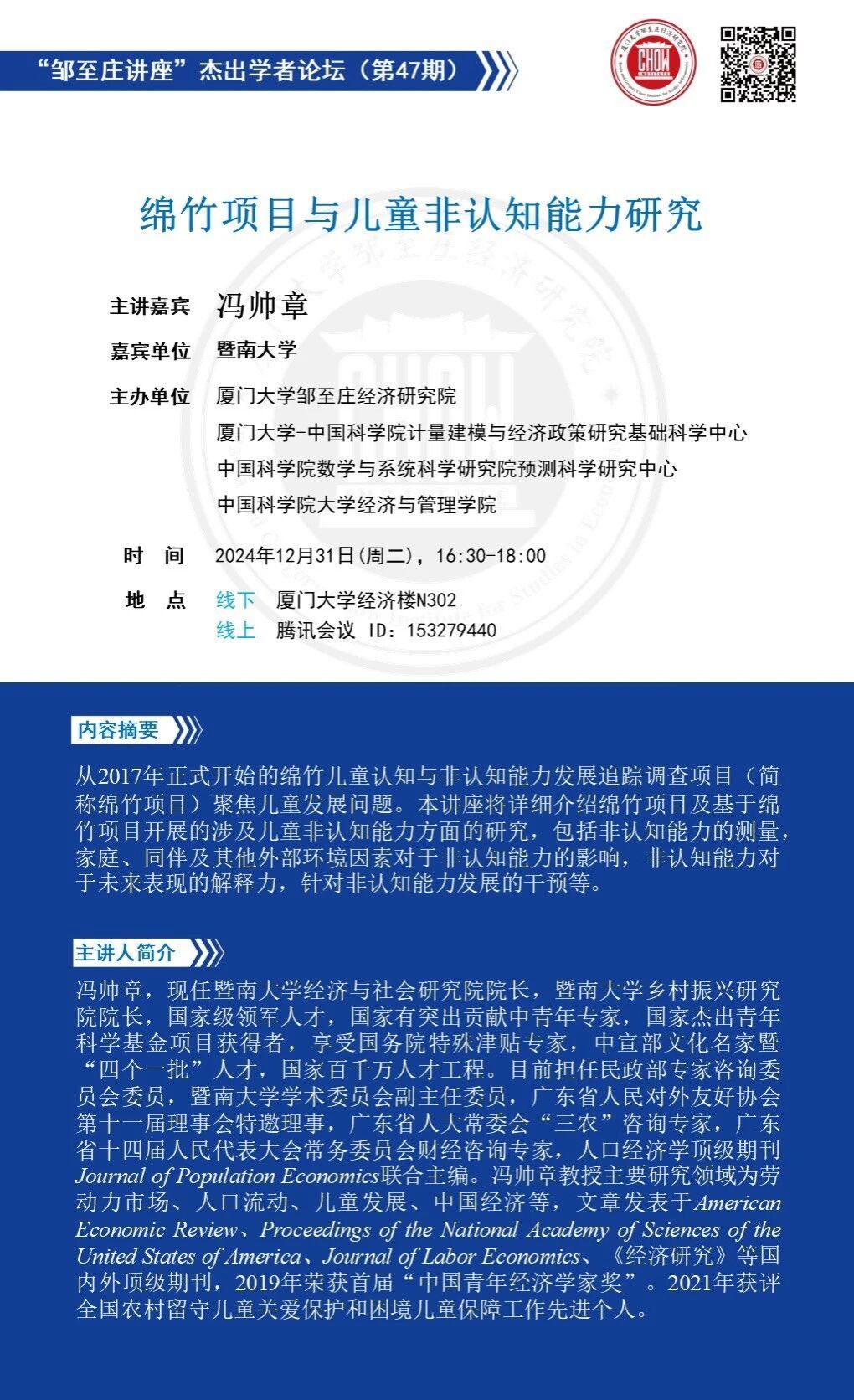 现任暨南大学经济与社会研究院院长,暨南大学乡村振兴研究院院长,国家级领军人才,国家有突出贡献中青年专家,国家杰出青年科学基金项目获得者,享受国务院特殊津贴专家,中宣部文化名家暨“四个一批”人才,国家百千万人才工程。目前担任民政部专家咨询委员会委员,暨南大学学术委员会副主任委员,广东省人民对外友好协会第十一届理事会特邀理事,广东省人大常委会“三农”咨询专家,广东省十四届人民代表大会常务委员会财经咨询专家,人口经济学顶级期刊Journal of Population Economics联合主编。冯帅章教授主要研究领域为劳动力市场、人口流动、儿童发展、中国经济等,文章发表于American Economic Review、Proceedings of the National Academy of Sciences of the United States of America、Journal of Labor Economics、《经济研究》等国内外顶级期刊,2019年荣获首届“中国青年经济学家奖”。2021年获评全国农村留守儿童关爱保护和困境儿童保障工作先进个人。