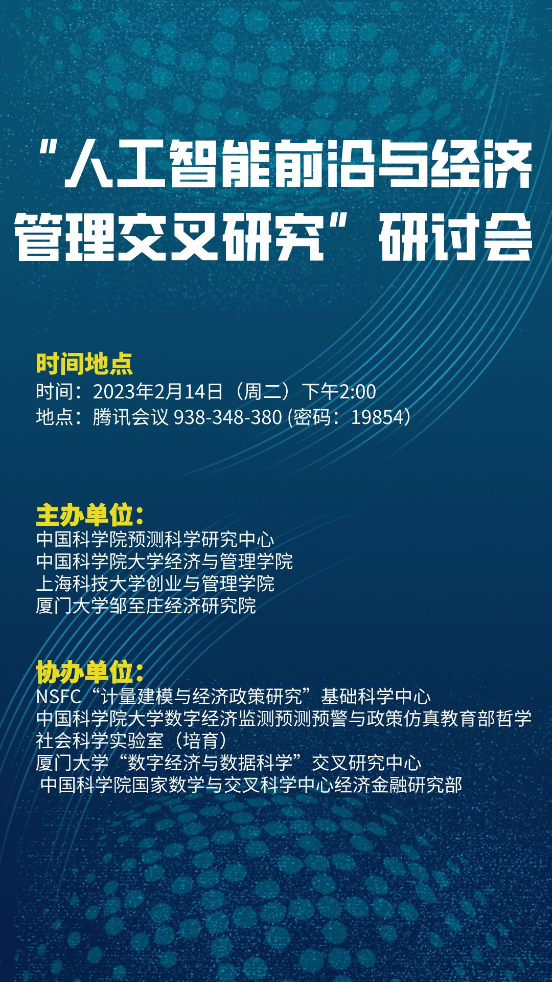 随着大数据、计算能力、学习算法的突破应用,人工智能已经成为推动人类经济社会发展的关键技术。近年来,Chat GPT、AIGC(生成式人工智能)、华为盘古等大规模预训练模型快速涌现,大模型(Foundation Model)正在成为人工智能领域的“新高地”,引领新一轮产学研智能化浪潮。这些人工智能前沿技术也深远影响着经济学、管理学、预测科学等领域的研究范式,带来了一系列全新的研究问题。为了更好促进人工智能前沿技术与经济管理学科的交叉研究创新,中国科学院预测科学研究中心、中国科学院大学经济与管理学院、上海科技大学创业与管理学院、厦门大学邹至庄经济研究院联合举办“人工智能前沿与经济管理交叉研究”研讨会,聚焦探讨Chat GPT、AIGC等人工智能前沿技术原理及其对经济学、管理学、预测科学等研究的影响,促进人工智能与经济管理学科的交叉融合,凝练关键科学问题,开展跨学科探索性研究。